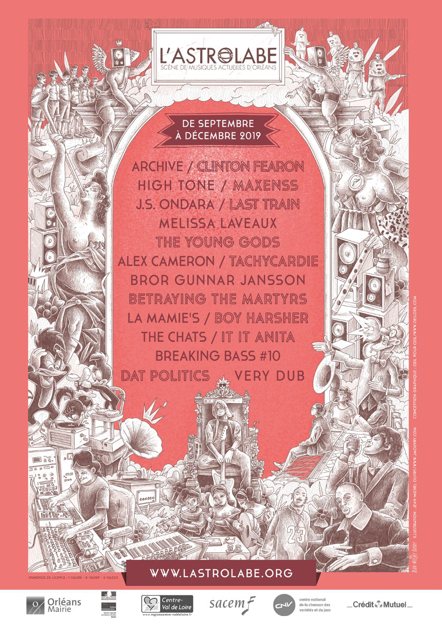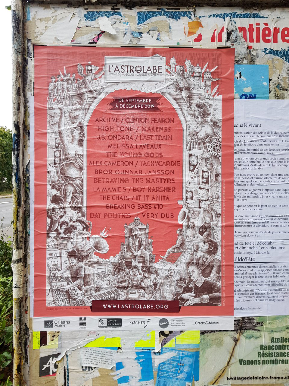 Conception et chartre graphique pour la Scène de Musiques Actuelles de la ville d'Orléans "L'Astrolabe". (https://www.lastrolabe.org/) Réalisations de l'affiche, du livret et déclinaison web.