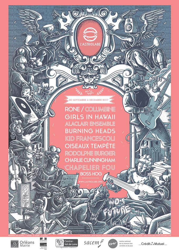 Conception et chartre graphique pour la Scène de Musiques Actuelles de la ville d'Orléans "L'Astrolabe". (https://www.lastrolabe.org/) Réalisations de l'affiche, du livret et déclinaison web.